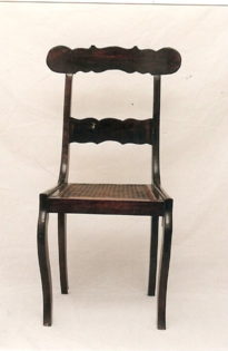 Cadeira, de manufatura singela e eclética, confeccionada em madeira (jacarandá), de estrutura quadrangular e assento dividido em duas traves, ambas com recortes em curva, sendo que na trave superior, o entalhe ultrapassa os montantes. Pernas dianteiras com joelheiras em curva e pernas posteriores levemente abauladas para trás. Não apresenta amarração em sua estrutura.
